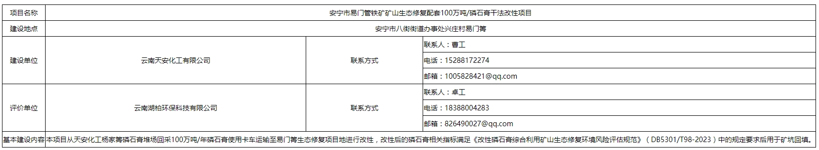 我公司擬在安寧市八街街道辦事處楊興莊村易門箐礦山生態(tài)修復工程項目范圍內建設100萬噸/磷石膏干法改性項目。現(xiàn)已委托云南湖柏環(huán)保科技有限公司編制了《安寧市易門箐鐵礦礦山生態(tài)修復配套100萬噸/磷石膏干法改性項目環(huán)境影響報告表》。