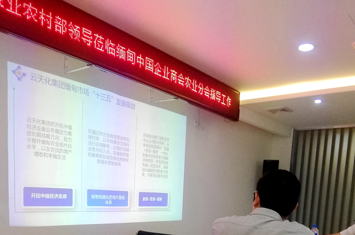 近日,中國農業農村部人事司司長潘顯政到緬甸中國企業商會農業分會座談調研,聽取在緬中資企業農業投資情況、實施“走出去”戰略取得的成績、存在的問題和困難以及需要的支持。中國駐緬甸大使館參贊楊守征陪同調研。公司旗下聯合商務下屬公司天際生物科技(仰光)有限公司參加座談,并代表中資企業發言。
