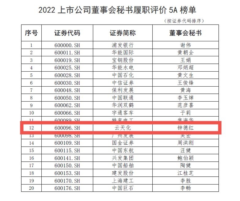 2022年12月12日,中國上市公司協會“2022年上市公司董事會秘書履職評價”結果發布。150位董秘榮獲5A評級,320位董秘榮獲4A評級,400位董秘榮獲3A評級。云天化榮獲5A評級。