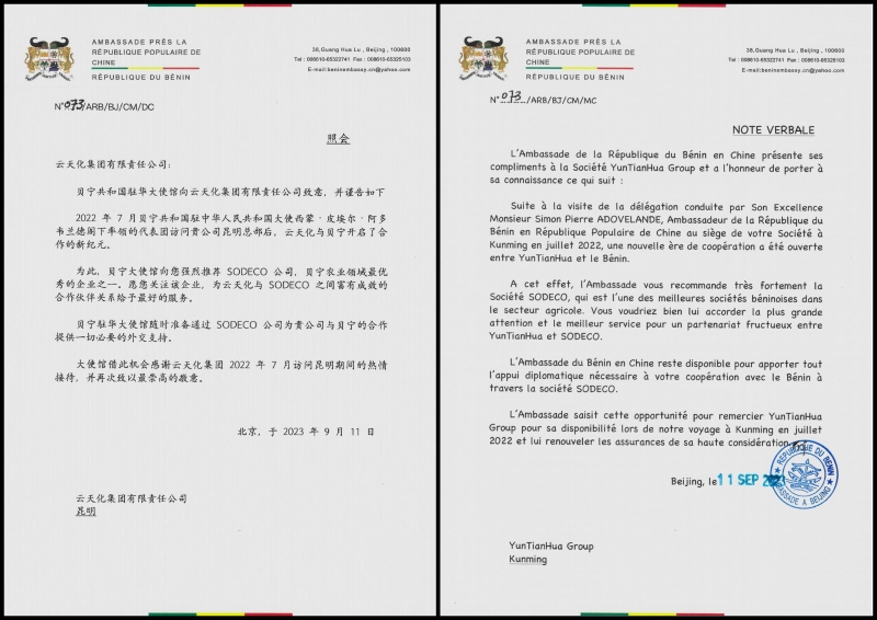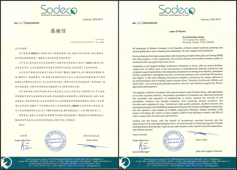 9月8日,云天化收到貝寧SODECO公司的感謝信,信中,貝寧SODECO公司及其全體員工對云天化向他們提供的產品、服務和科學種植技術表示了誠摯的感謝,表達了與云天化攜手并進,促進中、非企業合作交流的良好愿望。9月11日,云天化收到貝寧共和國駐華大使館發來的照會,對2022年貝寧共和國駐華大使西蒙·皮埃爾·阿多維蘭德到訪云天化給予的熱情接待表示感謝,表示愿意為云天化與貝寧農業領域最好的企業——SODECO公司的合作給予最好的服務。