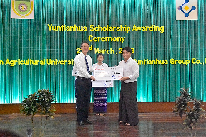 3月22日,在緬甸耶津農業大學首屆“云天化獎學金”頒獎典禮上,云天化集團總經理胡均為緬甸耶津農業大學在讀20名優秀學士生、6名優秀碩士生和3名優秀博士生,頒發2.9萬美元的獎學金,助力莘莘學子圓夢。中國農業部全國農技中心首席專家高祥照、緬甸農業部研究司司長奈枝溫(NaingKyiWin)、耶津農大校長妙覺博士(MyoKywe)及學校師生代表參加了緬甸耶津農業大學首屆“云天化獎學...